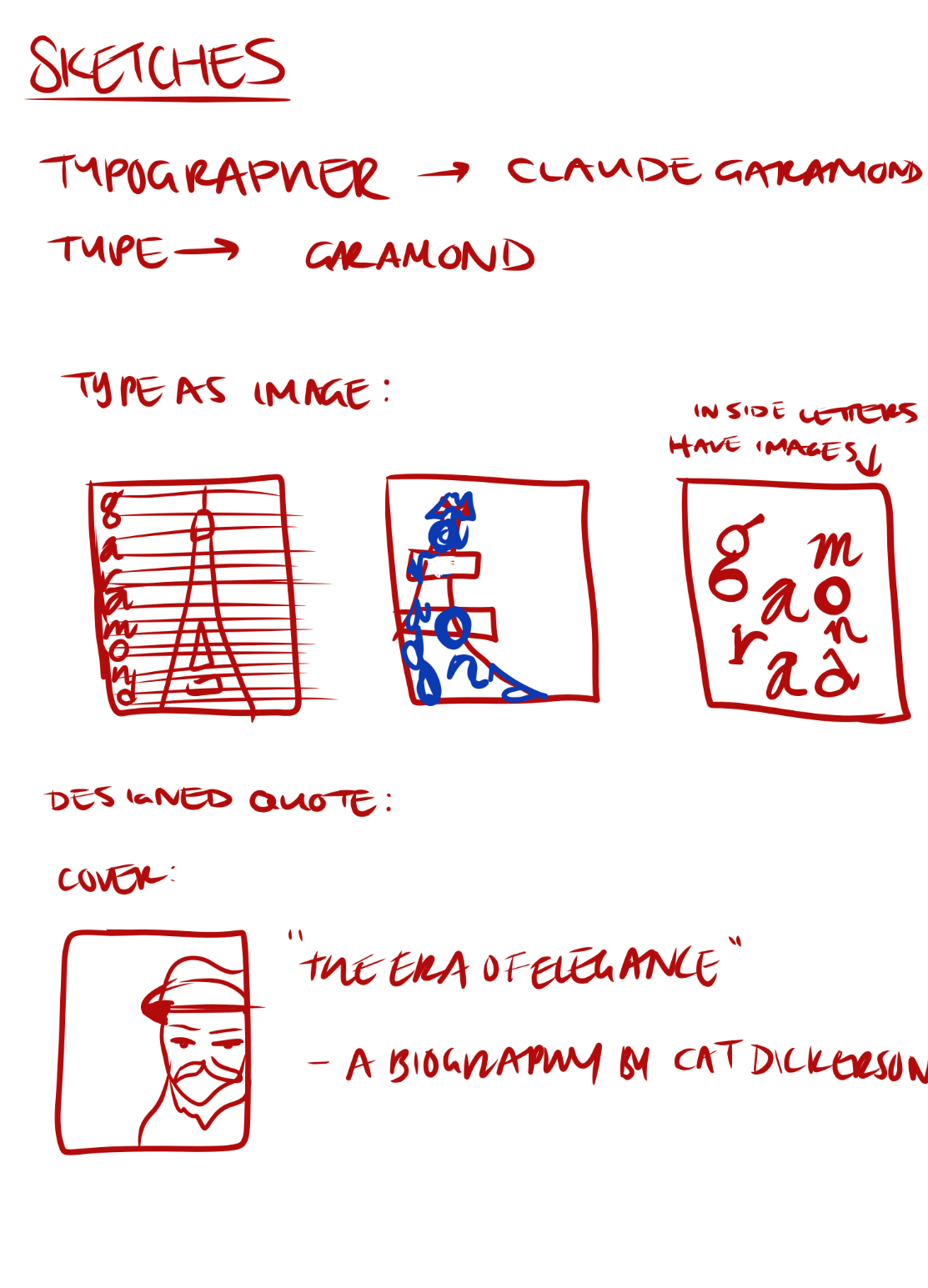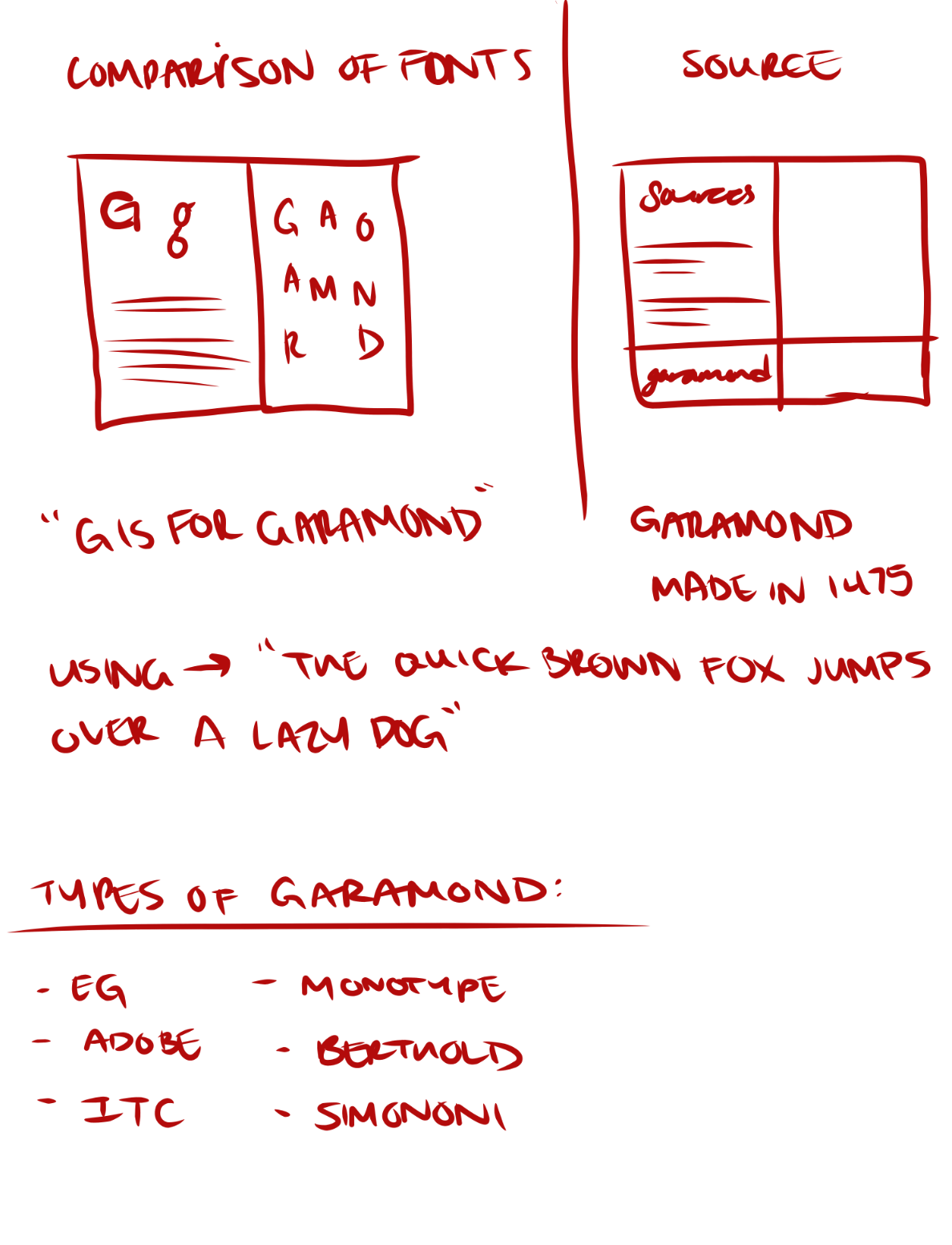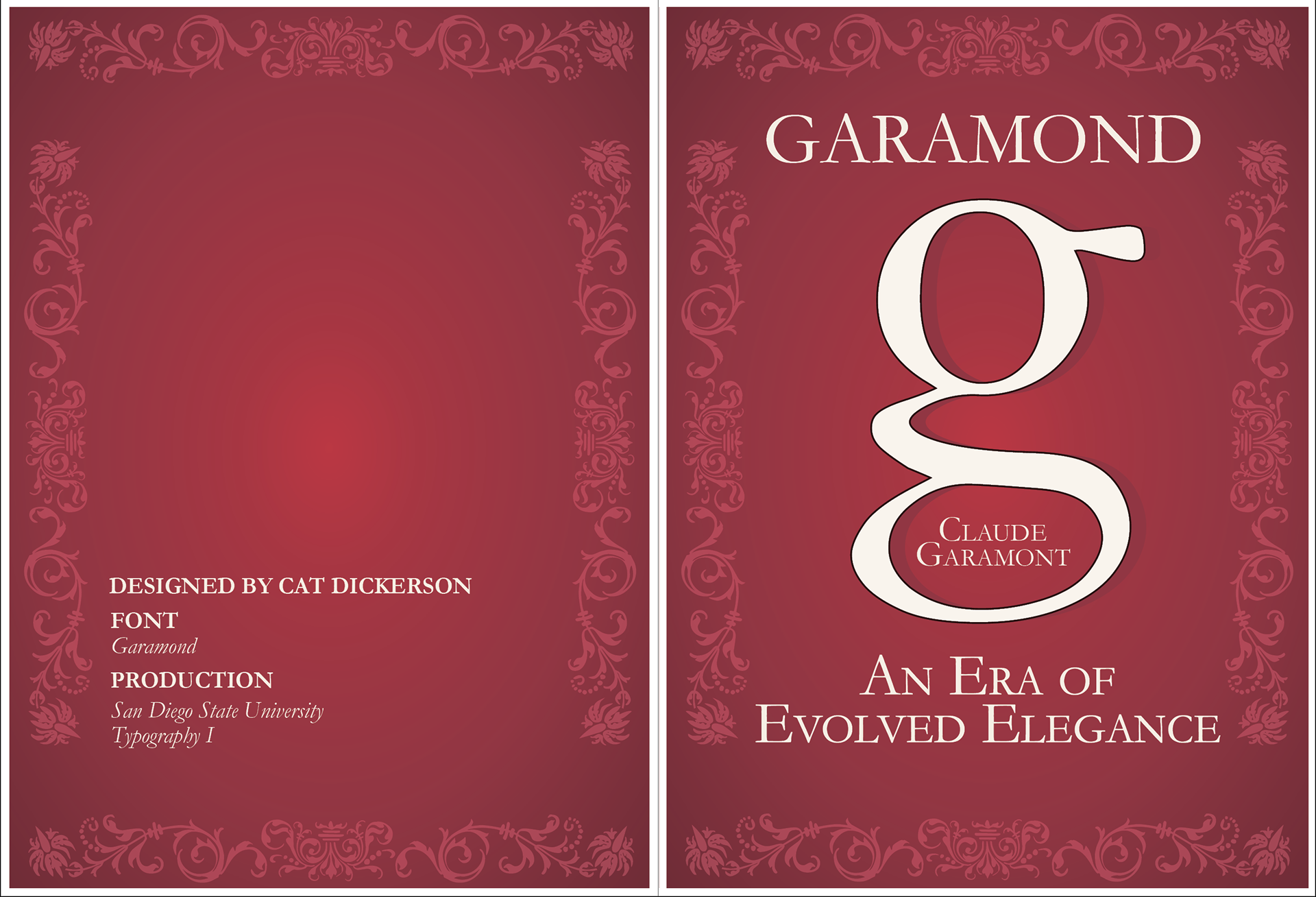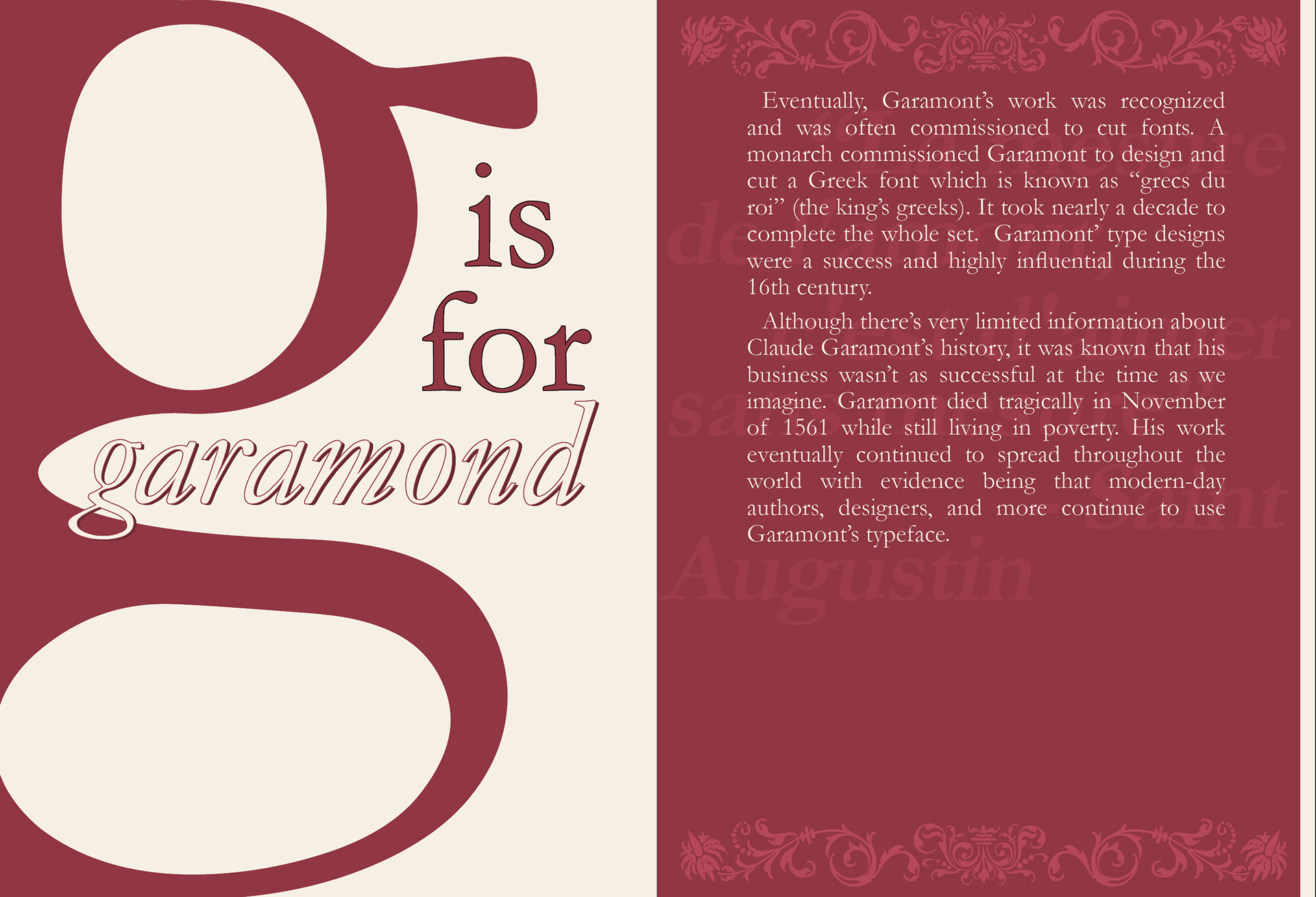For this project, I selected the font Garamond, made by Claude Garamont. I wrote an essay about his early life, how Garamond has evolved, and how it is still used up to today. The process involved studying Type + Image, Designed Quote, Font/Alphabet, and Type Specimen.